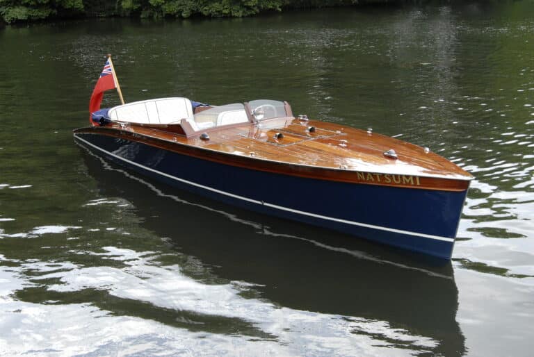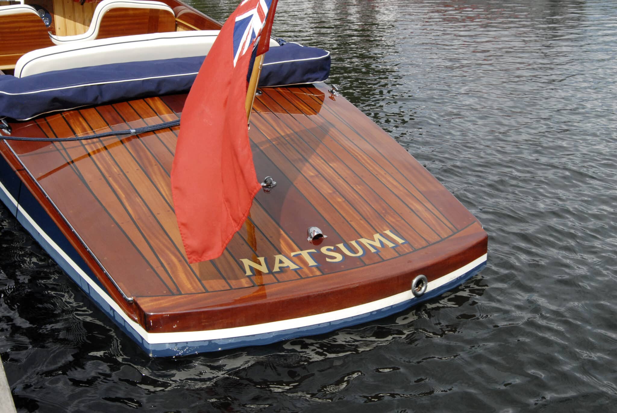 Natsumi is a special boat and an excellent example of an Andrews 25’ Greyhound Slipper Stern Launch. She is one of only 156 boats that were built at Andrews Boathouses in Bourne End. Originally built for exhibition at the 1960 London Boat Show, boat no 444, she was named ‘Elkay’ and later renamed ‘Fairmead’.