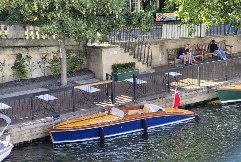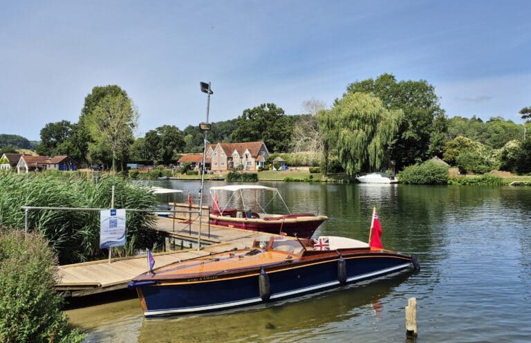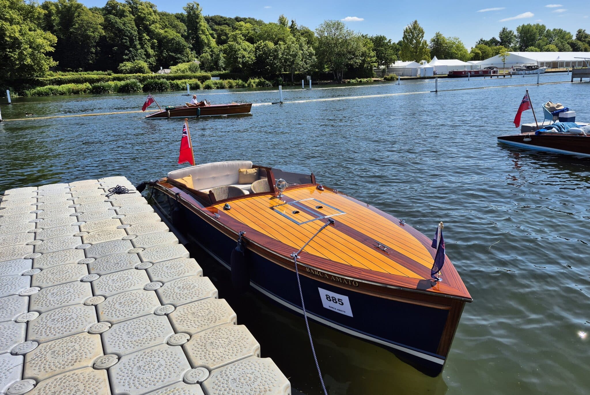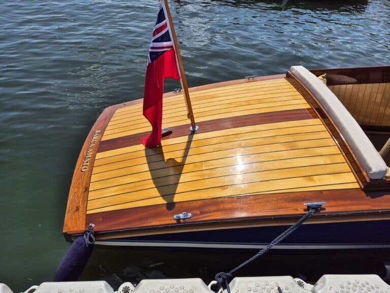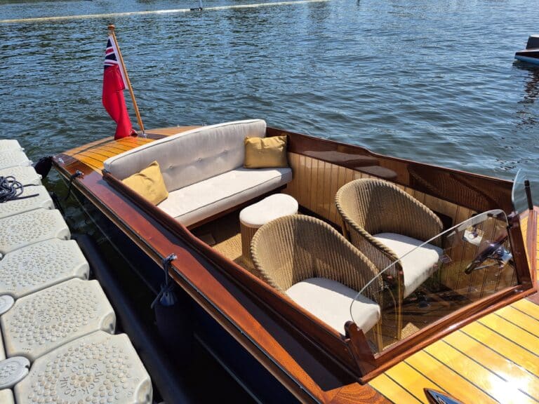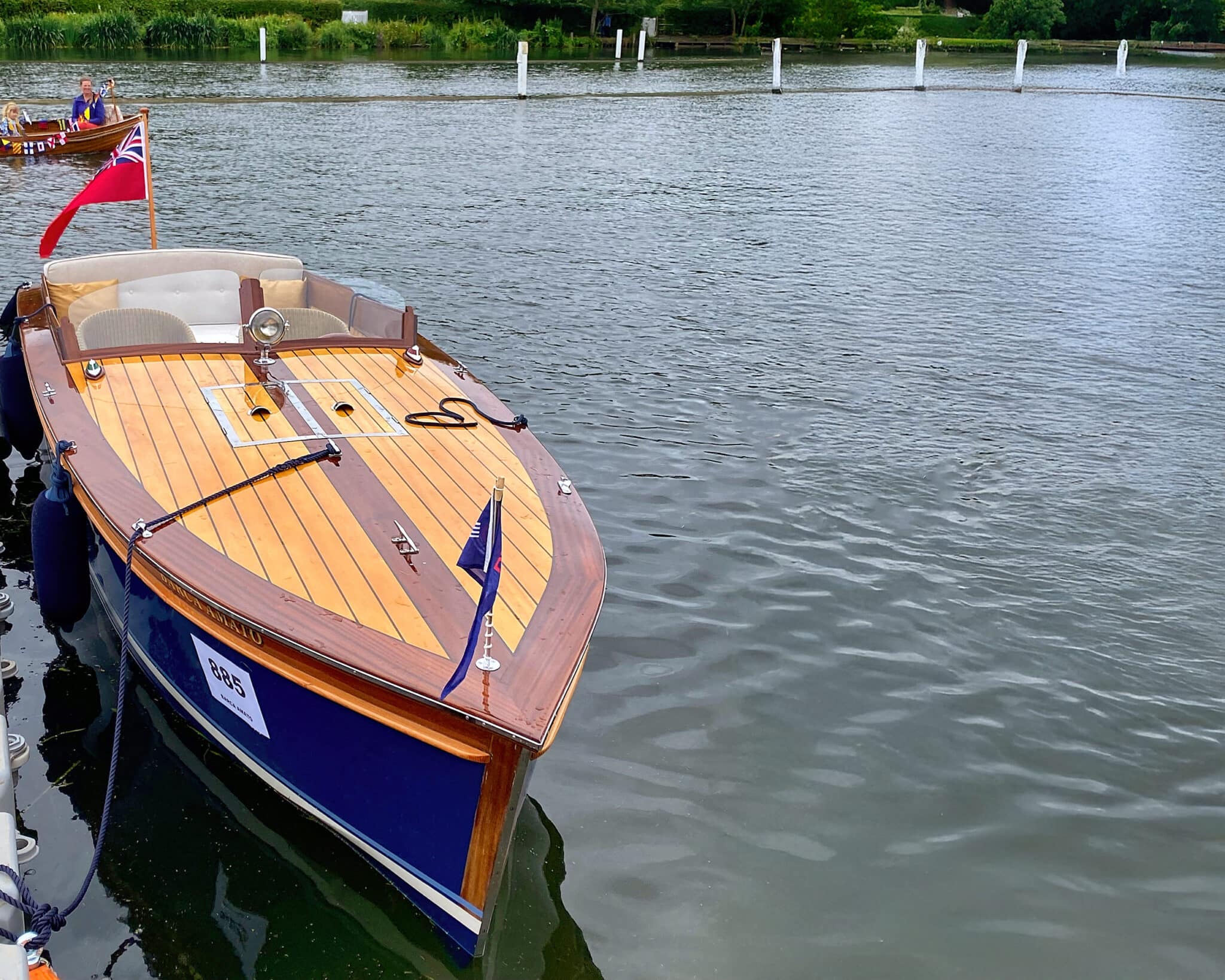 An open launch in the style of a Thames Slipper, designed by Selway Fisher and built by Mr Doug Battersea. She has a raked stem and the typical “slipper launch” sheerline sloping down to the waterline at the stern block. The hull construction is simple single chine with sawn frames and the hull skin is epoxy bonded and sheathed plywood. The hull is painted up to a varnished sheer rubber and sheer strake. The decks and cockpit are varnished. She is powered by a 3.5Kw 48-volt electrical propulsion system supplied and installed by TELCO (Thames electric launch company).