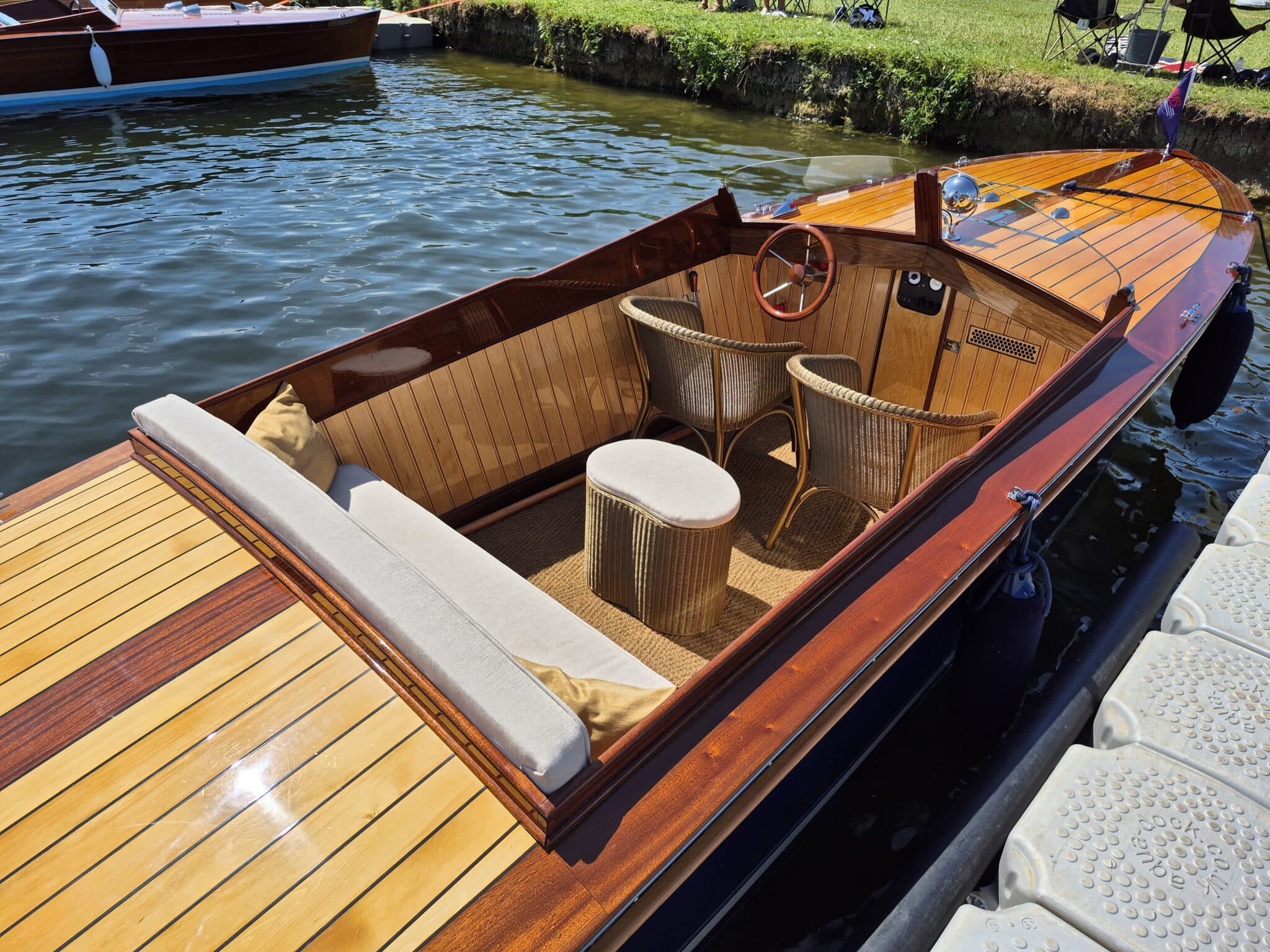 This is an exceptionally well built slipper launch with plans by a well known designer and painstakingly built by a very talented chap in South Oxfordshire. He decided to go electric and chose an excellent system with in built charger and all the necessary instrumentation. Seating four to five there are two lloyd loom seats and an aft bench with room between for small table. Built of marine ply with solid pine decks and the hull painted royal blue with covers to match this is a fine example of a modern slipper with a bespoke trailer included in the sale.