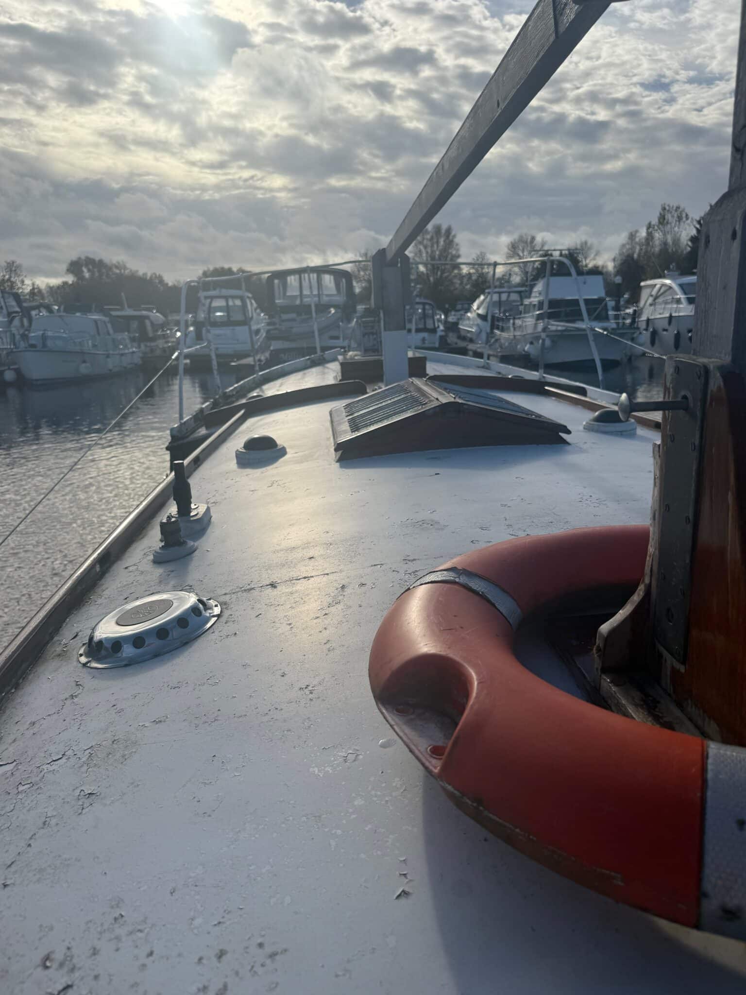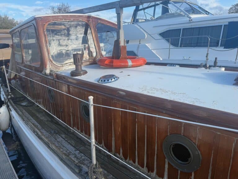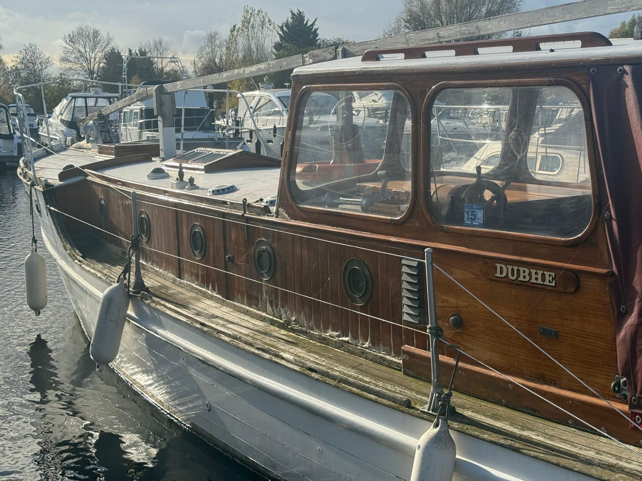 At 35 feet in length with a beam of 8 feet and a draft of 3 feet 9 inches, Dubhe is well proportioned for Thames cruising. Her superstructure is teak, and although the extent of any structural work required is currently unknown, she clearly shows the bones of a boat that was once beautifully cared for.