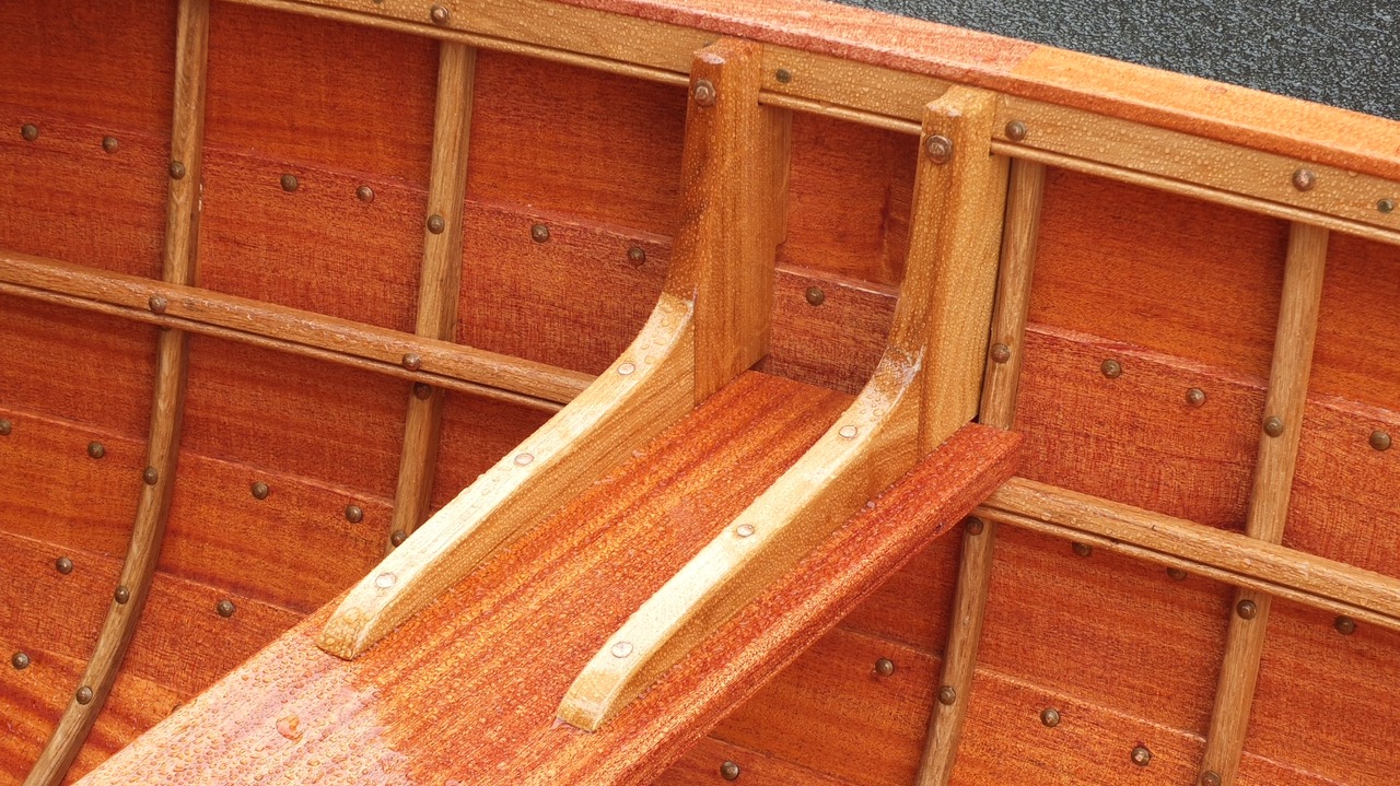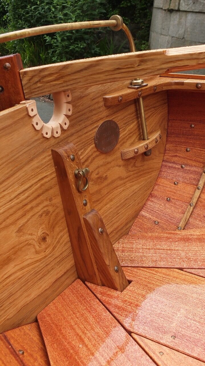 She was built in 2016 to a circa-1910 design using traditional materials and methods, and it shows in every detail. Her construction is mahogany on oak, with thoughtful brass fittings throughout, including keel band, bilge rubbing bands, and ring bolts to bow and stern. Mahogany capping rails, fitted sole boards, and a removable oak boarding post add both practicality and refinement.